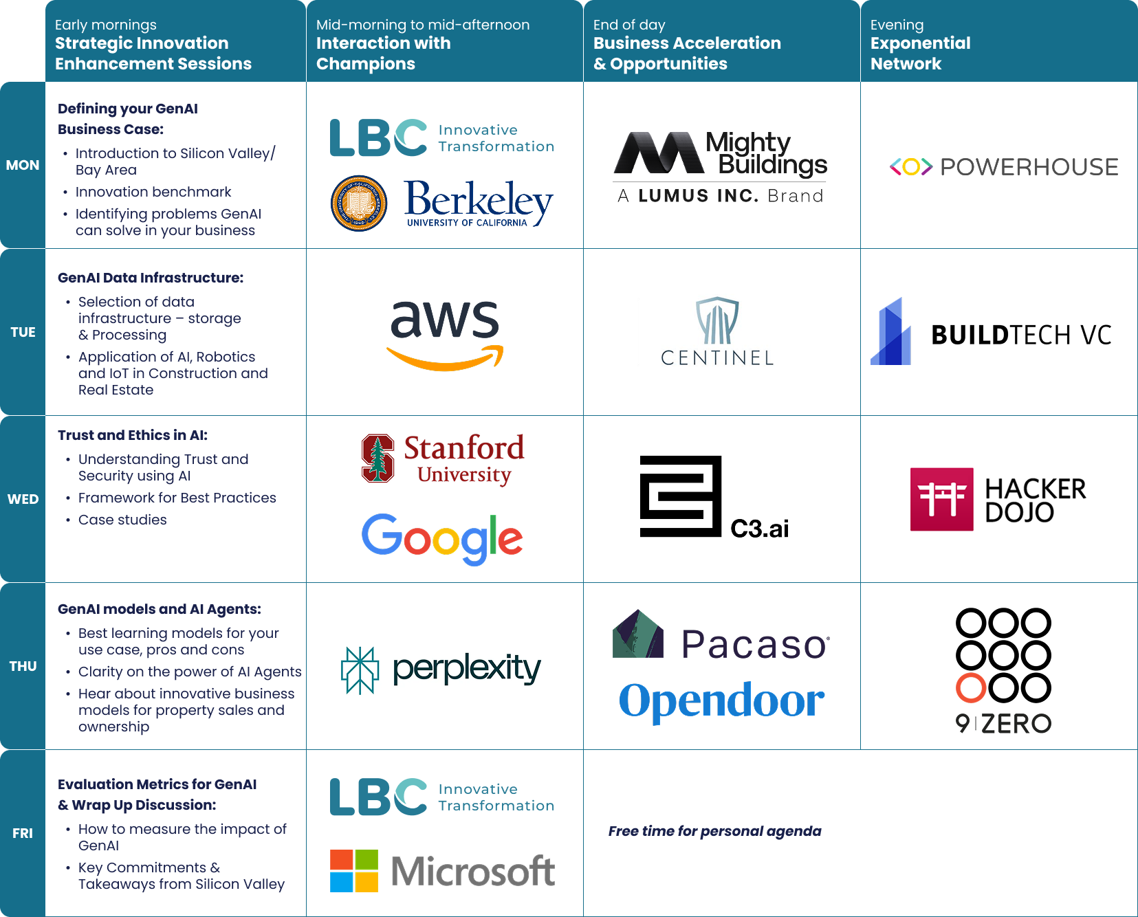 Topic Enhancement Sessions Early Mornings | Winning Mindset & the Future of Energy: What is distinctive of the Silicon Valley culture The Future of Energy | Clean energy future Key takeaways | The AI roadmap: How will GenAI impact the Energy markets | The Business of Decarbonization: How does Silicon Valley view Decarbonization opportunities | Wrap Up & Takeaways: Key Commitments & Takeaways from Silicon Valley |